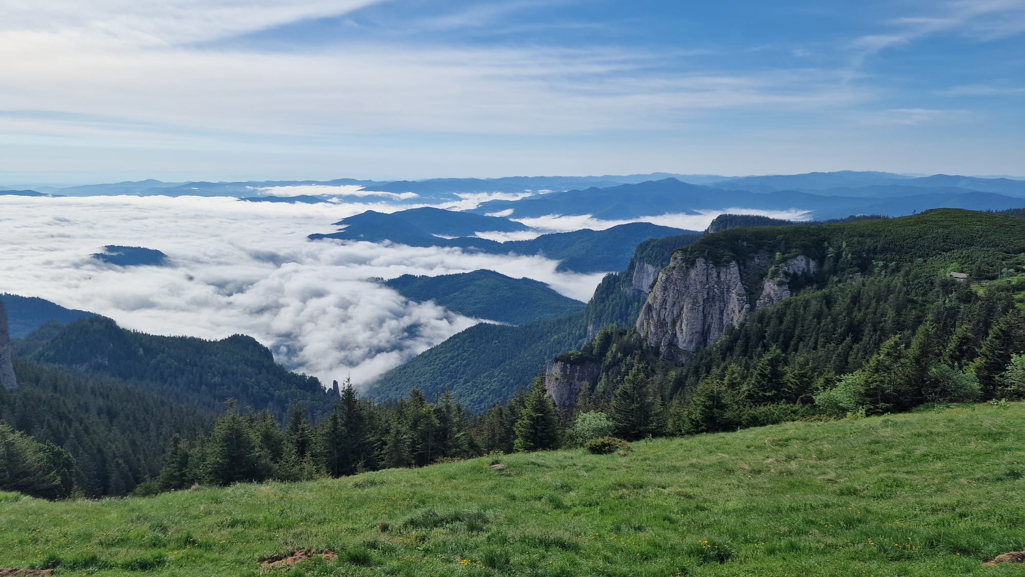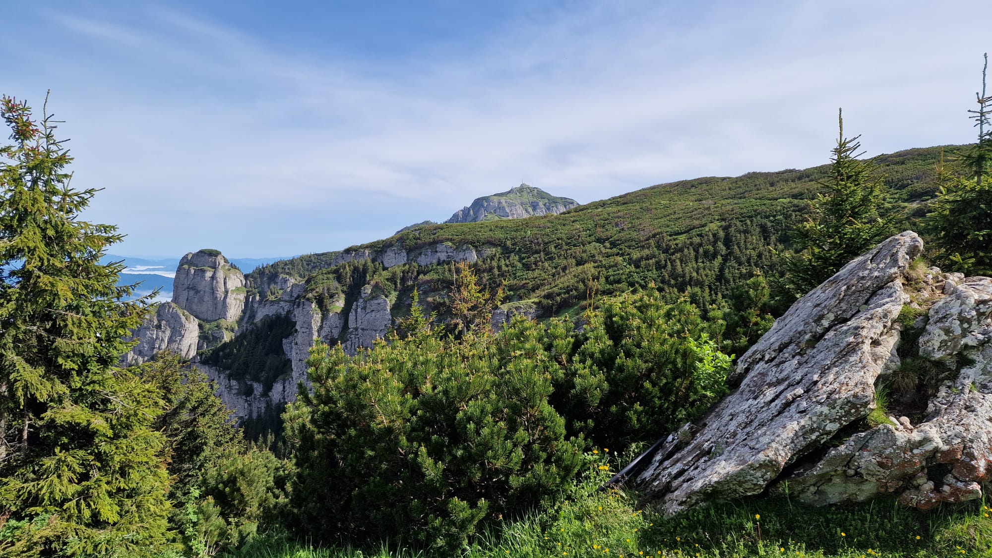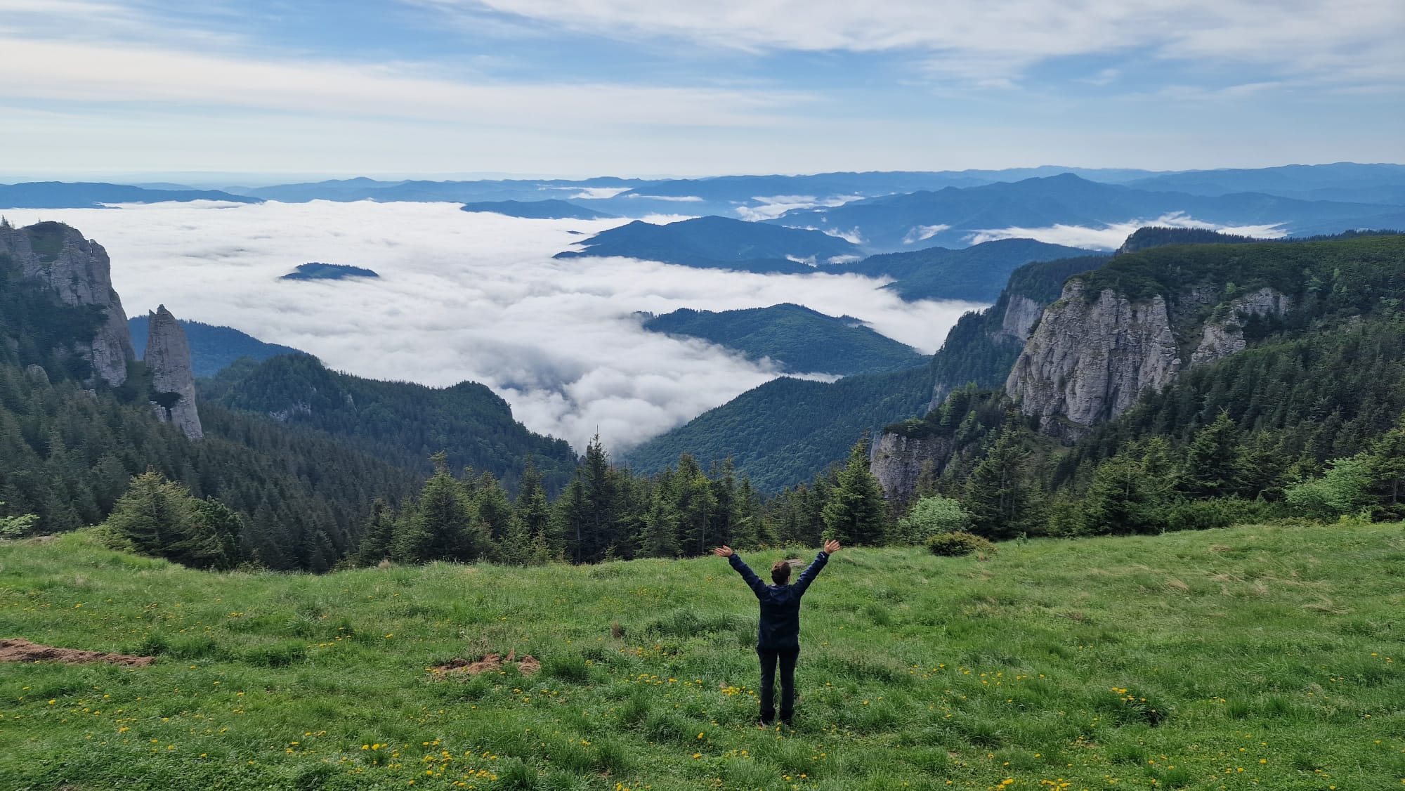 Ceahlăul este spectacol, dar nu te lăsa păcălit, urcușul e greu, iar muntele nu se lasă ușor cucerit. Jertfa noastră a fost depusă cam în zona La Morminte, puțin mai sus de crucea eroilor neamului, – care au apărat cu viața lor pământul strămoșesc, în Șaua Curmătura, în cel de-al doilea război mondial -, când deodată ne-au învăluit norii și s-a despicat cerul, slobozind tunete, fulgere și o ploaie torențială cu gheață. Pelerinele de ploaie nu mai făceau față, eram deja la o altitudine considerabilă, unde cu greu mai găsești adăpost, semnele de atenționare în privința viperelor ne dădeau fiori, iar ploaia se scurgea șiroaie pe versant. După aproape o oră ploaia s-a oprit, norii s-au disipat, iar în lumina caldă a soarelui s-au arătat pe rând Panaghia, Vârful Toaca, Scăldătoarea Vulturilor și Piatra Ciobanului. Eram deasupra norilor și în jur erau tufe de afine, clopoței de munte și muguri de brad.