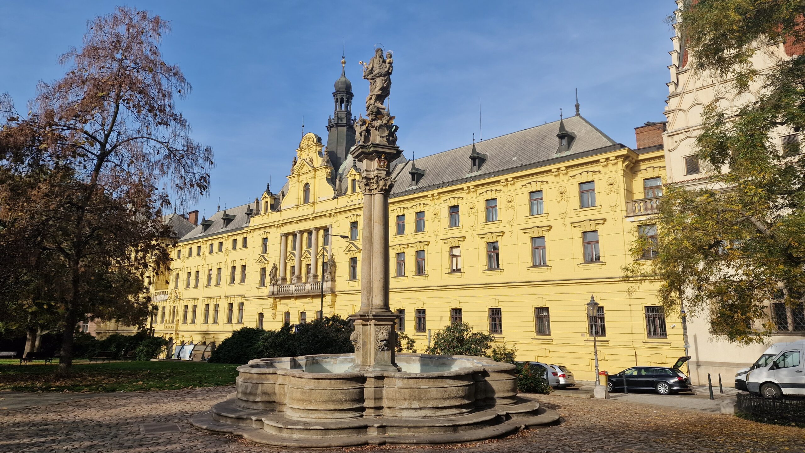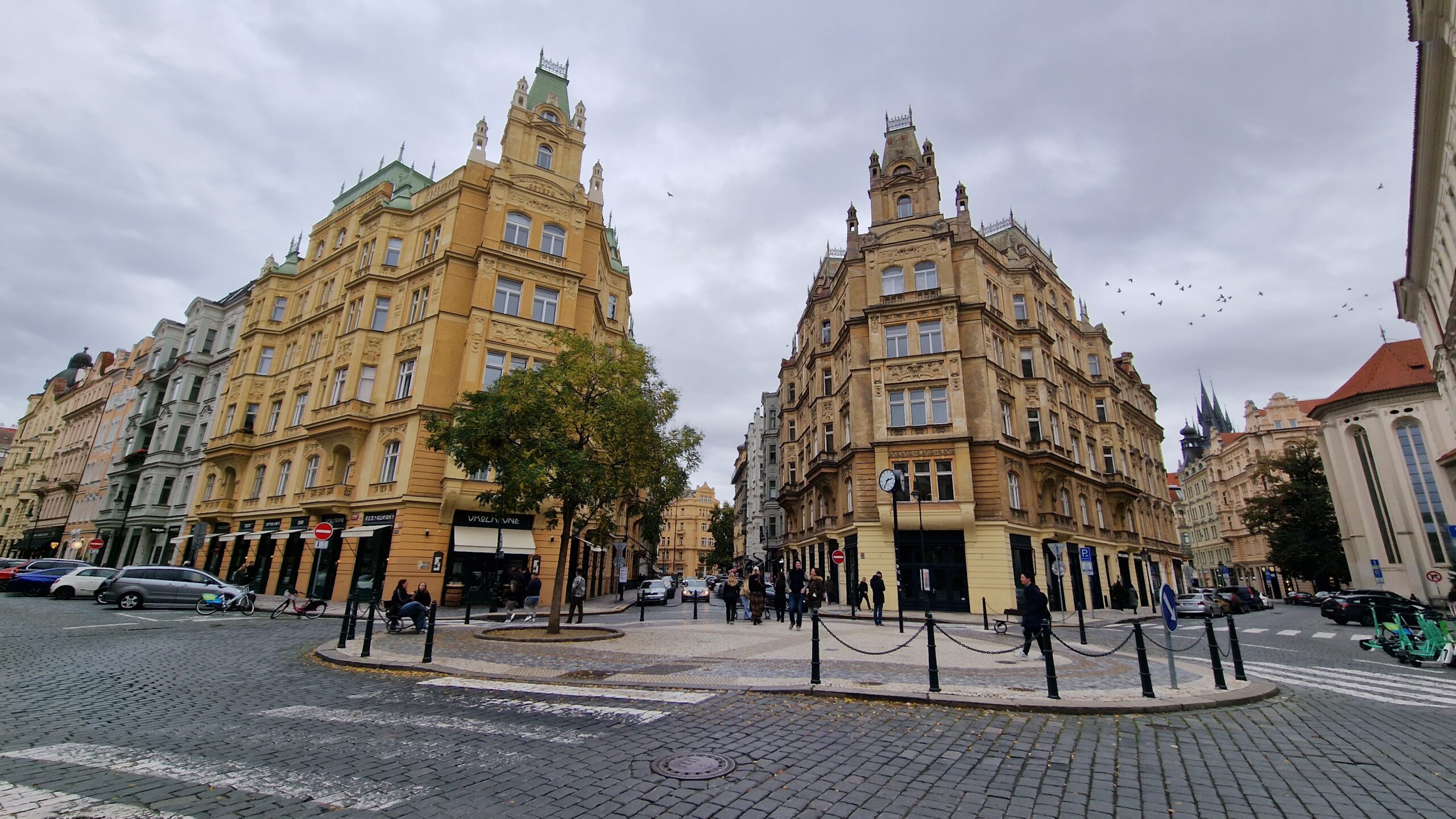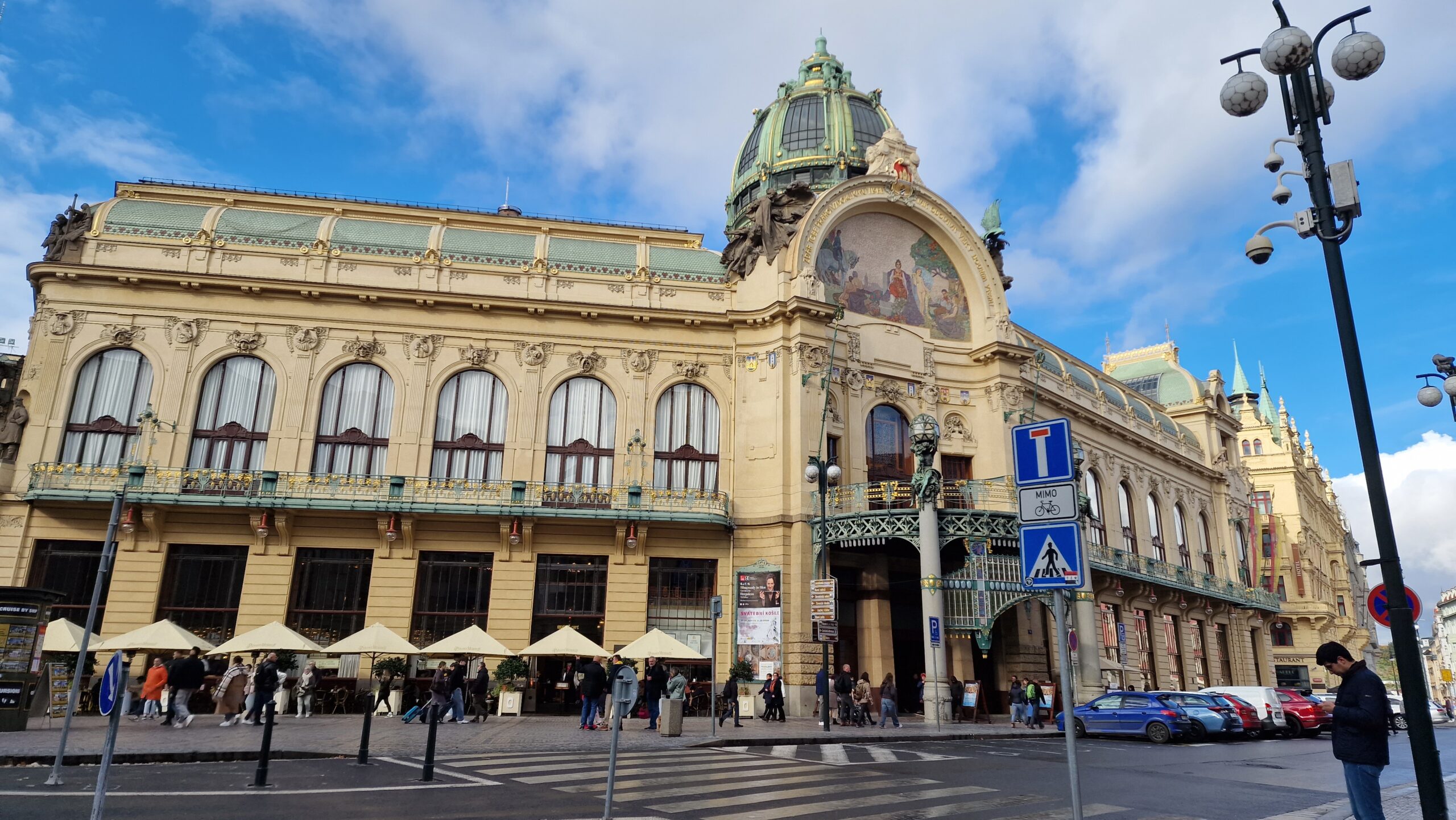Primăria nouă se află în piața Karlova, lângă stația de metrou Karlova Namesti, iar de aici, dacă ne continuăm drumul pe strada Resslova, ajungem la Casa Dansatoare (Tancici Dum) și mai apoi urmând firul apei spre podul Carol, ajungem la teatrul național (Narodni Divaldo) și cafeneaua Slavia.