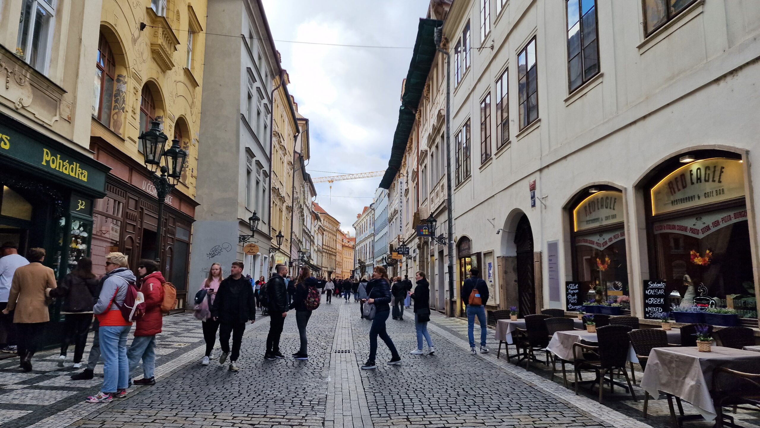 De cealaltă parte a podului, găsim una dintre cafenelele cu tradiție din Praga: Cafe Slavia, unde ștrudelul cu măr e la el acasă. Aș dori să precizez că Praga este unul dintre orașele europene cu cele mai accesibile prețuri când vine vorba de gastronomie. Mari producători de bere, în special Pilsner Urquell și Budvar, praghezii se mândresc cu bucătăria tradițională, precum goulash și găluște de griș, care poate fi savurată atât în puburile locale – U Fleku, U Pinkasu, U Prince (supa de lobster) etc., cât și în nenumăratele restaurante disponibile. Restaurantul Le Grill, este un loc special, care dispune de o grădină interioară și preparate cu mult gust. Iar Luka Lu este un loc ideal pentru iubitorii de pește și fructe de mare. În Praga se consumă foarte mult kurtos, însă acesta e puțin reintepretat, fiind mult mai mic și umplut cu înghețată, spre deliciul tuturor.