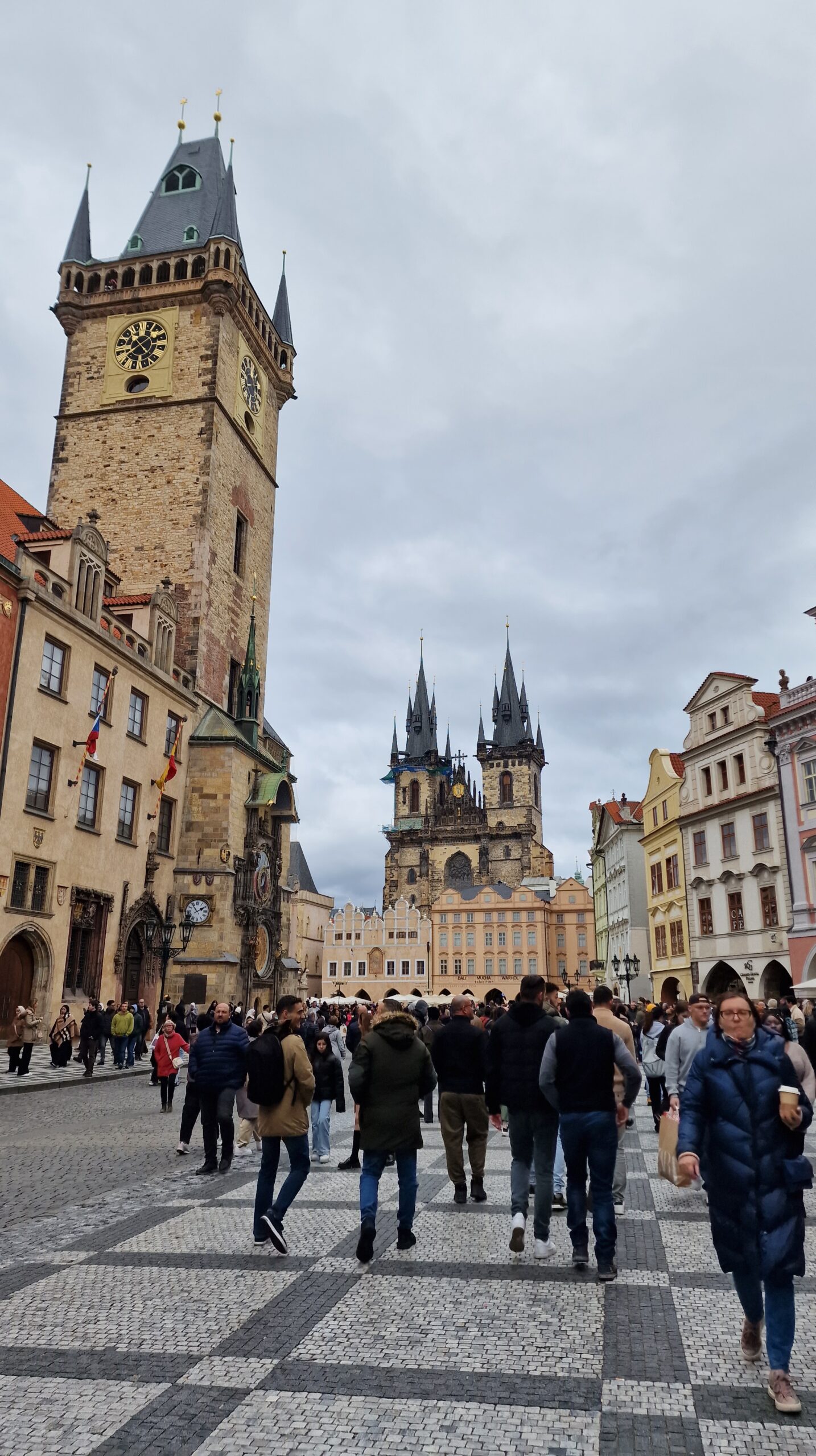 Dar să ne întoarcem în piața orașului vechi, unde putem admira ceasul astronomic și turnul primăriei, dar și spectacolul defilării Apostolilor, care are loc la fiecare oră fixă. Tot aici se află și biserica gotică închinată fecioarei din Tyn, biserica Sf. Nicolae (alta) și statuia lui Ian Has. De aici ne putem continua drumul pe strada Celetna, care găzduiește case cu relevanță arhitecturală și istorică: Trei regi, Leul alb, Soarele negru, Madona neagră, cu o scară interioară senzațională pentru iubitorii de arhitectură. Strada duce mai apoi la Turnul de pulbere, alături de care se află casa municipală, o clădire Art Nouveau. Tot în apropiere, pe strada Zeletna se află teatrul de stat, iar strada Parizska duce către Josefov – cartierul evreiesc, unde se află și statuia lui Kafka, lângă sinagoga spaniolă.